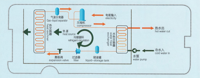 热泵热水机组运用卡诺原理和工质的屋里特性,通过压缩机做工,使工质产生屋里相变(气态——液态——气态)。利用这一往复循环相变不断地吸热和放热。有吸热大量吸收空气中的热量,通过热交换器向热水中不断放热,如此反复循环,使水箱中的冷水升温,制热过程电热能转换能达到400%以上。